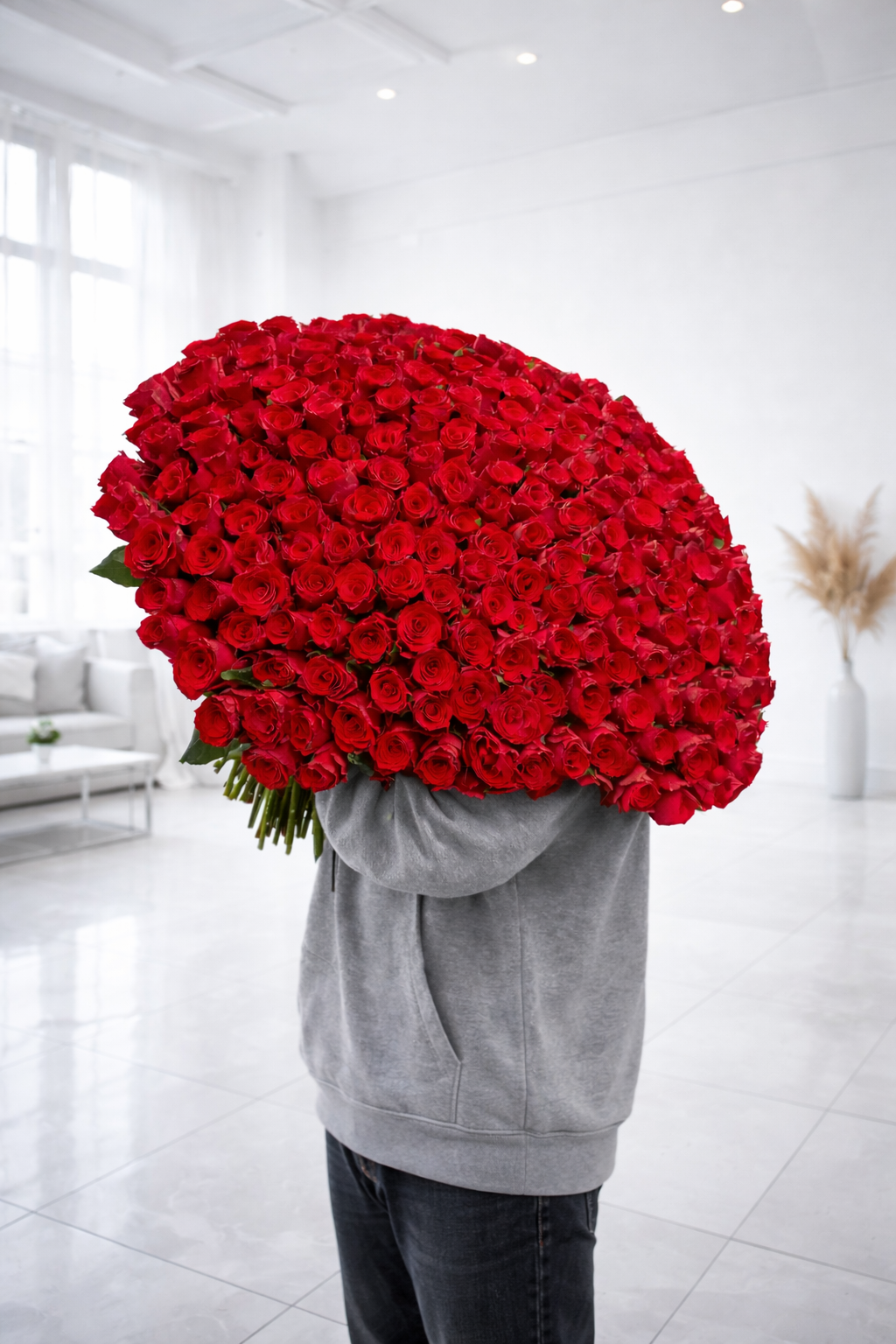 A fearless, oversized dome of 300 premium roses packed tight with zero space for subtlety. Lush, bold, and unapologetically extra — this bouquet doesn’t hint at feelings, it declares them.