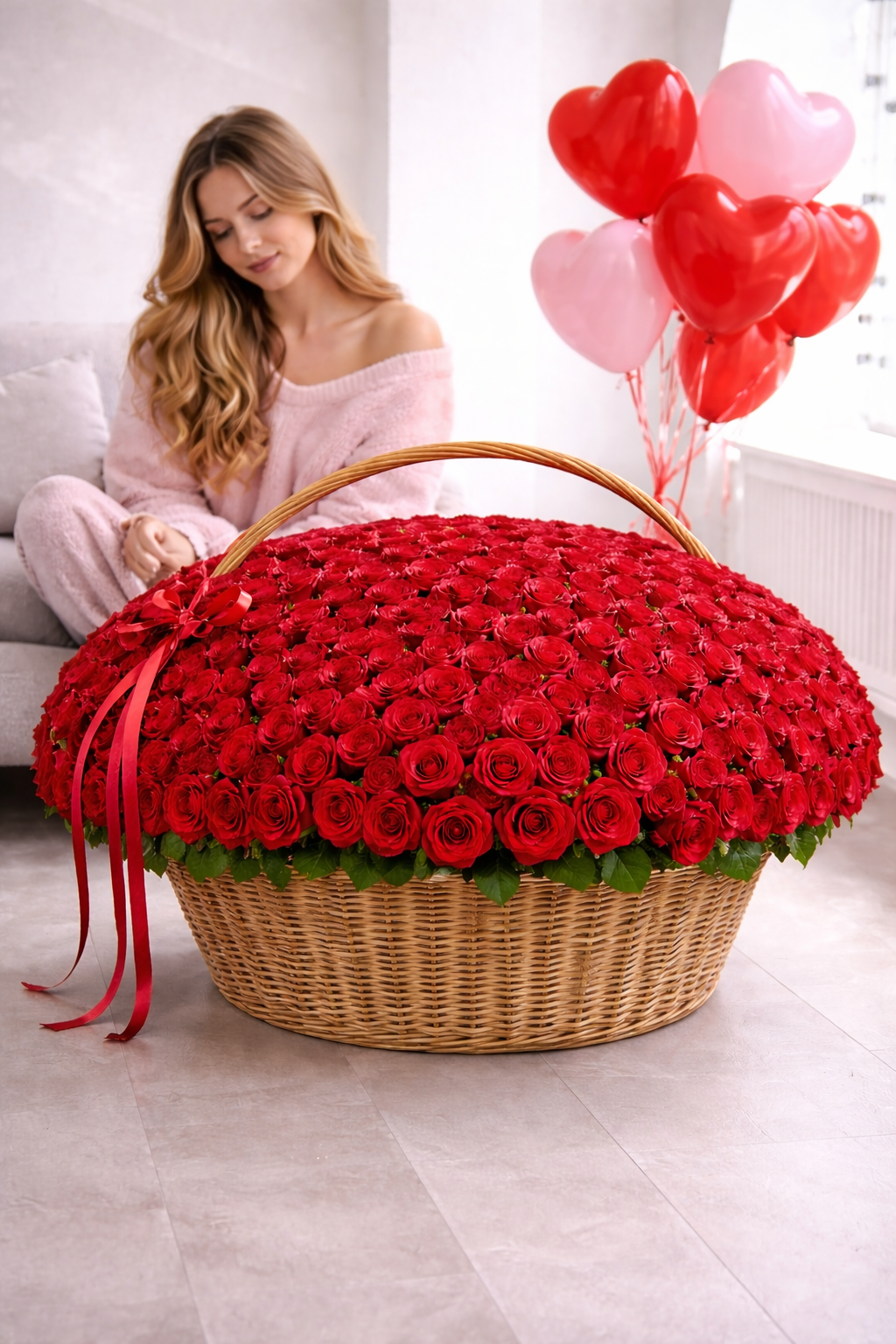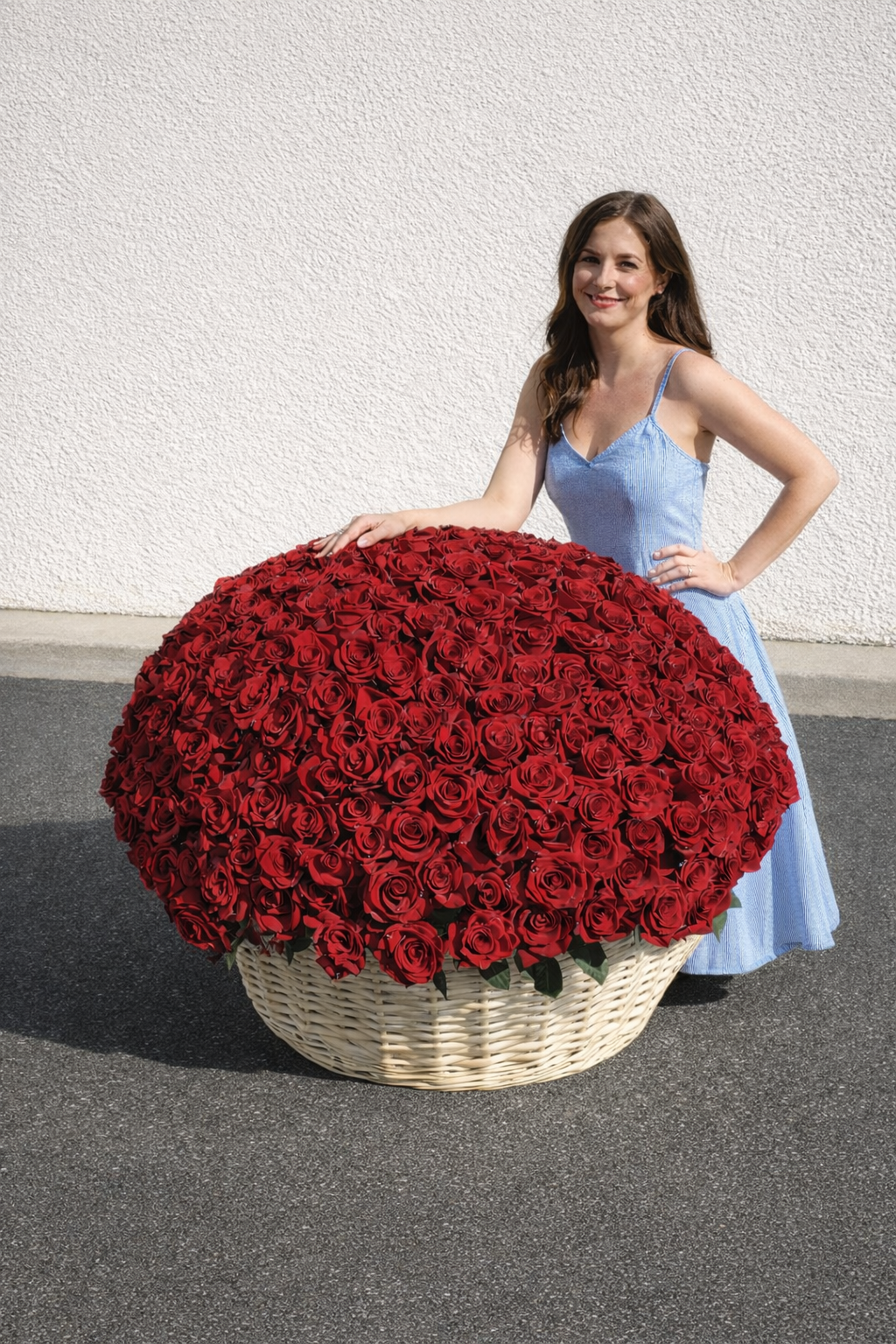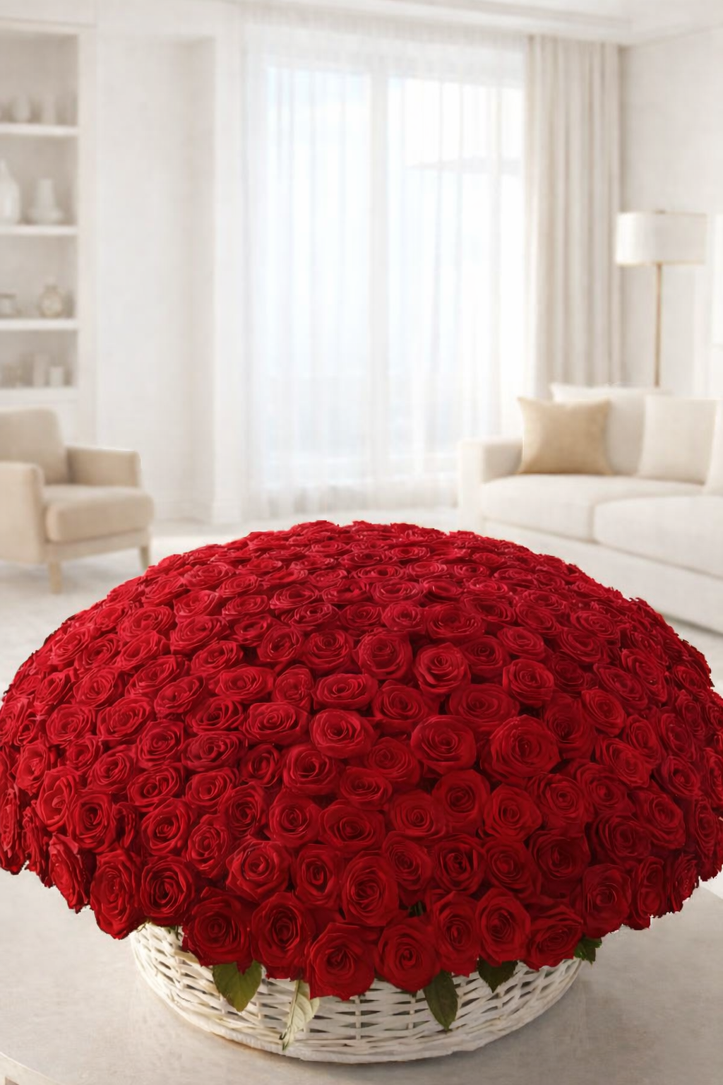 This luxurious basket features 300 premium roses, densely arranged to create a full, rounded silhouette that feels rich, bold, and undeniably romantic.